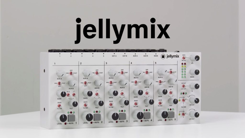 Après avoir fait parlé de lui lors du dernier salon Superbooth, Intellijel annonce enfin la disponibilité du Jellymix. Ce nouveau mixeur analogique stéréo compact à cinq canaux, conçu pour devenir le centre névralgique de ton home-studio, offre une réserve de gain de +26dB et plusieurs fonctions pour chaque tranche : un filtre coupe-bas commutable fixé à 150 Hz, un égaliseur Tilt centré à 810 Hz (+/-10dB), deux départs auxiliaires avec leur commutateur Pre/Off/Post dédié et un commutateur de routage principal Main/Filter.